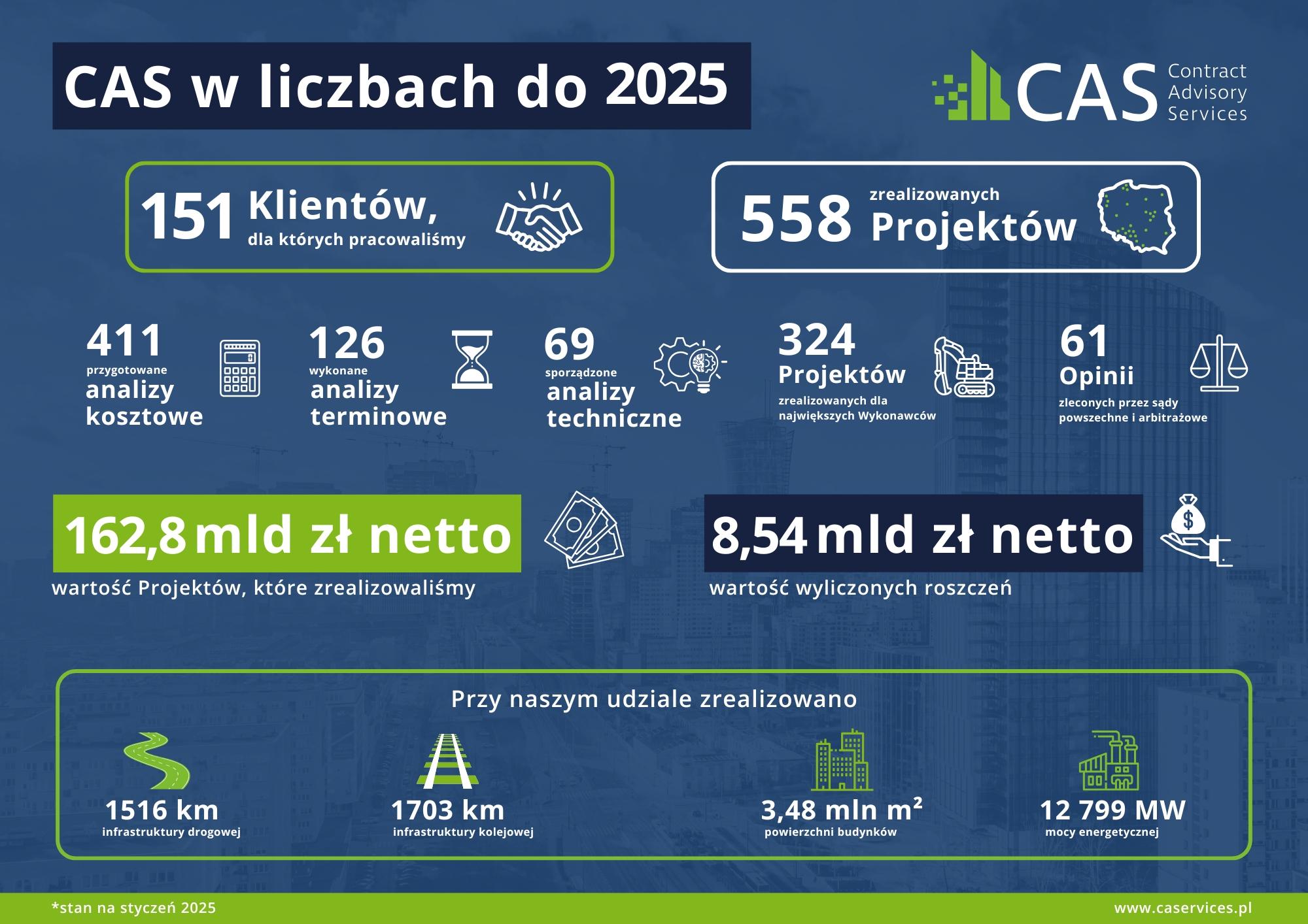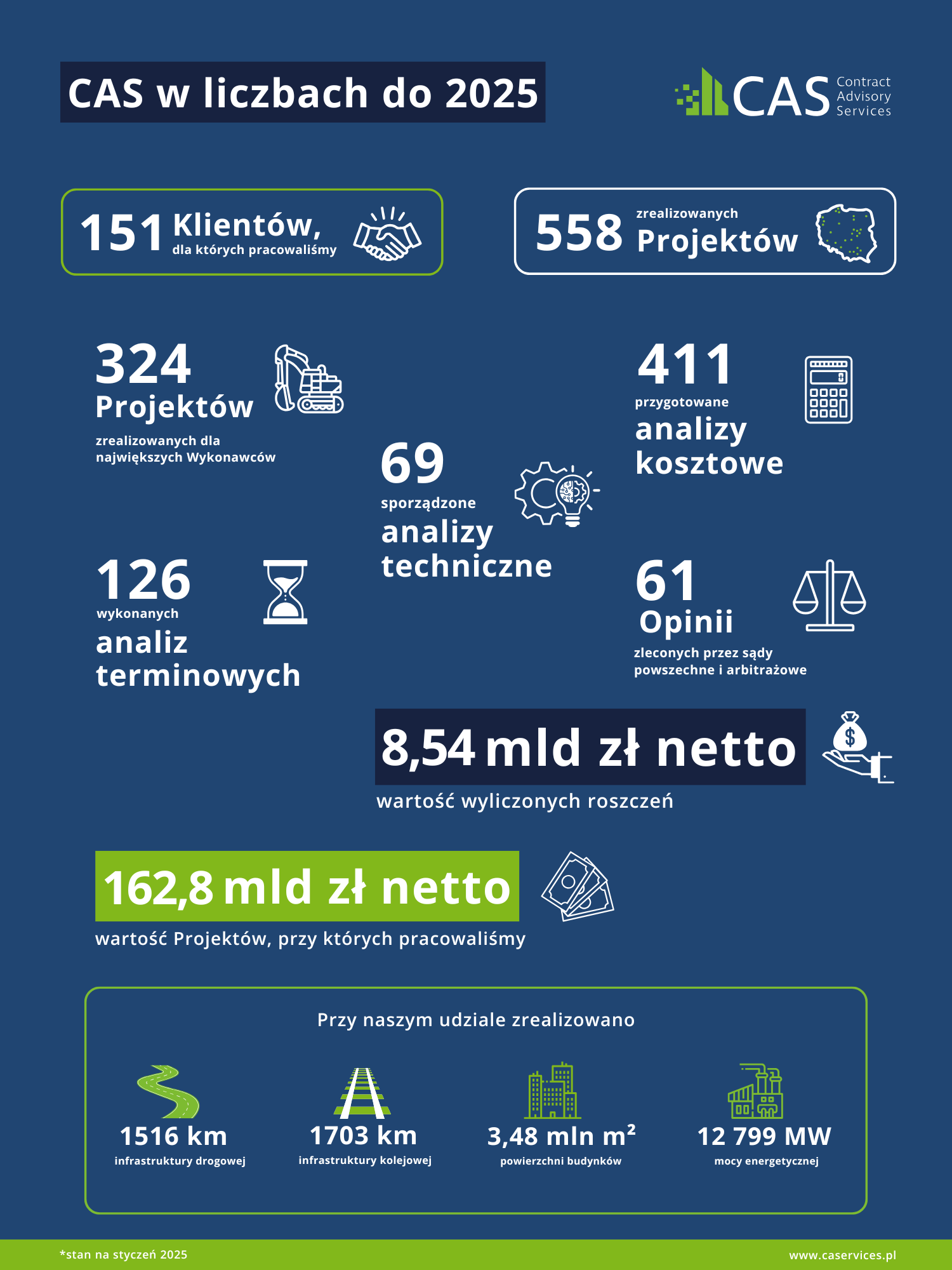 *Przedstawione projekty zostały zrealizowane m.in. przez Ekspertów i Specjalistów przedstawianych na stronie CAS. Projekty te realizowane były zarówno w okresie współpracy Ekspertów i Specjalistów z CAS jak i w ramach ich zatrudnienia w wiodących międzynarodowych firmach Wykonawczych i Konsultingowych oraz pełnienia funkcji biegłych sądowych.